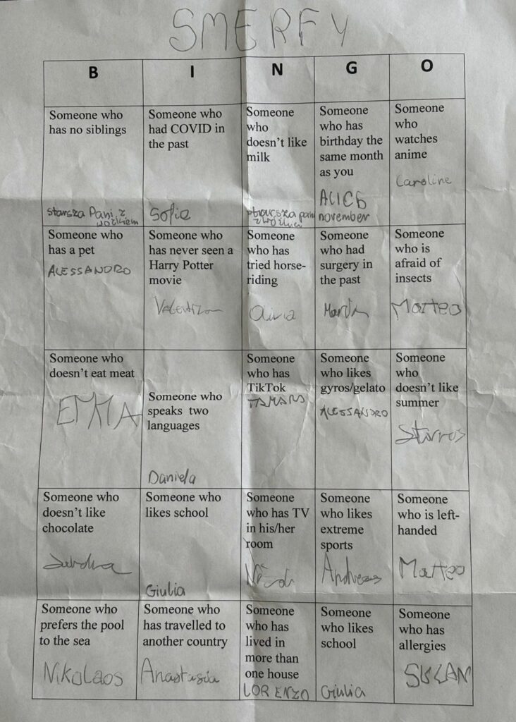 Dzisiejszy dzień był pełen wrażeń. Po śniadaniu wyruszyliśmy na grę terenową bingo – było mnóstwo śmiechu i zdrowej rywalizacji. Poprzez udział w grze terenowej rozwijaliśmy umiejętności komunikacyjne w języku angielskim, doskonaliliśmy kreatywność i refleks językowy oraz umiejętności organizacyjne i współpracę w grupie. Po krótkiej przerwie czekał na nas obiad, a zaraz po nim świętowaliśmy urodziny Leny – było słodko, głośno i bardzo radośnie.