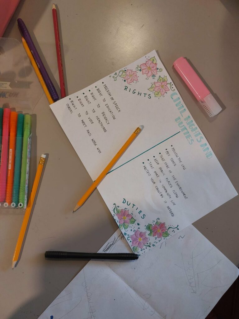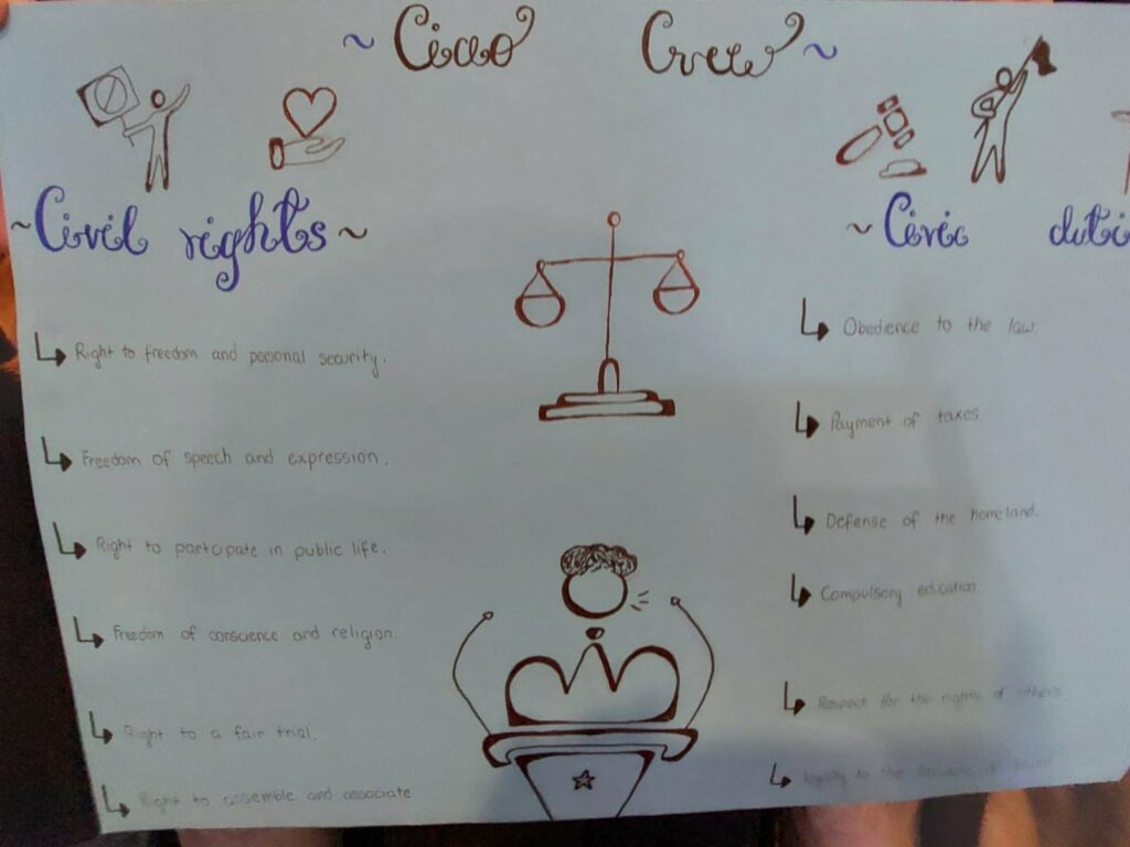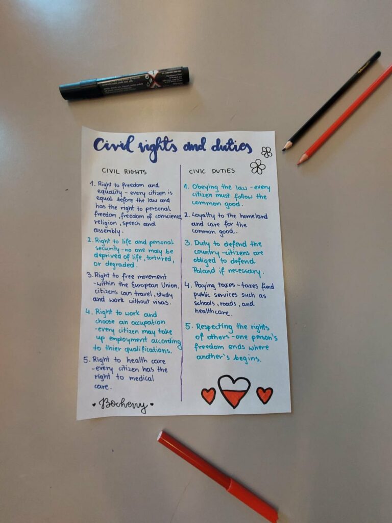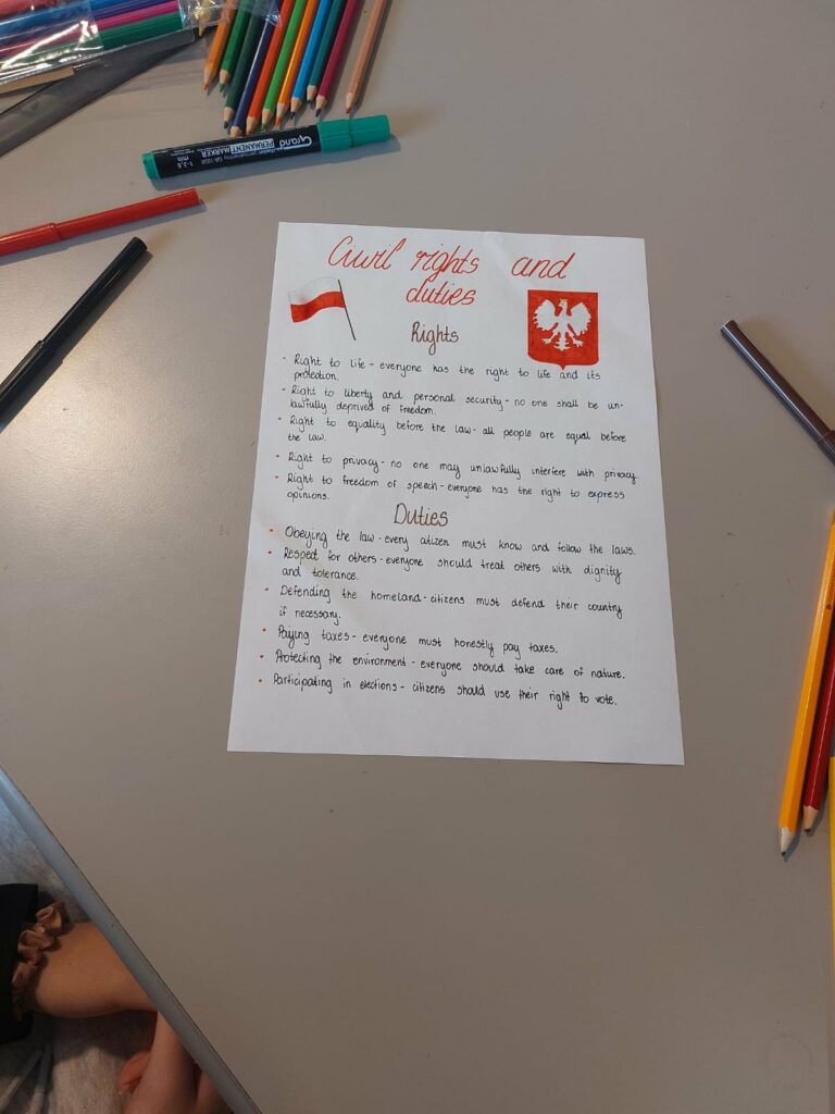 In the afternoon, we took part in a project workshop during which we made posters and leaflets about citizens’ rights and duties. Working on the project enabled us to learn how to make responsible decisions, develop competencies related to social engagement, and foster an attitude of openness and respect towards others.
