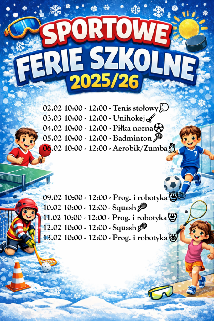 Poniżej przedstawiony jest plan zajęć dla chętnych, które będą odbywać się w czasie ferii.