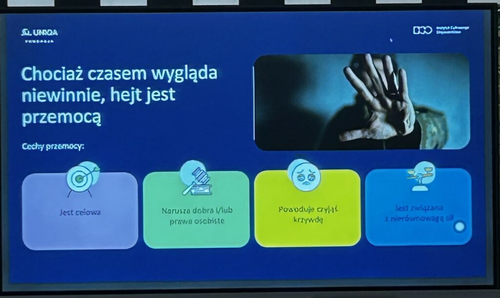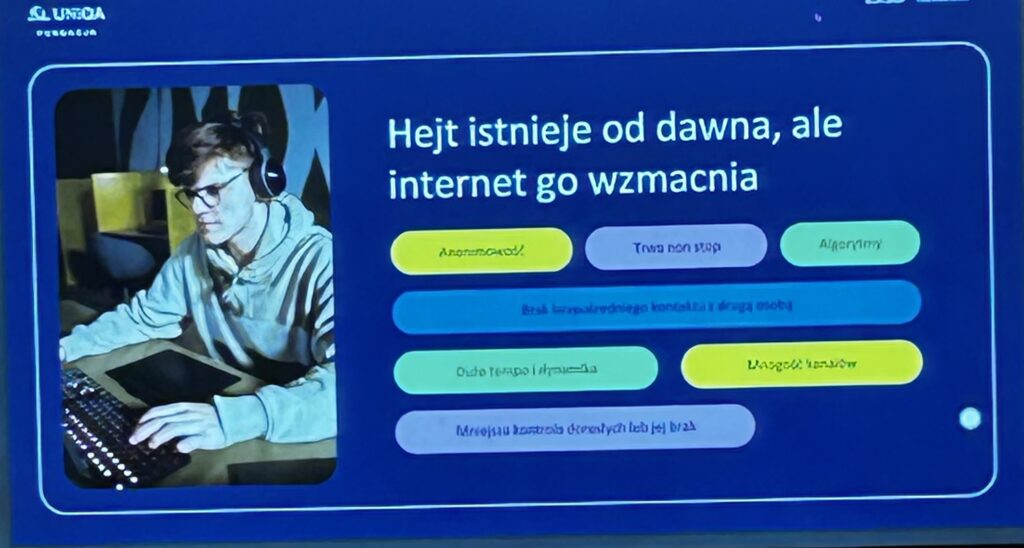 Podczas prelekcji dla nauczycieli i rodziców, którą poprowadziła pani Ewa, rozmawialiśmy o tym, jak rozpoznawać hejt, jak na niego reagować i jak wspierać młodych ludzi, którzy stają się jego ofiarami. Pani Ewa zwróciła uwagę, że kluczowe znaczenie ma rozmowa, empatia i edukacja cyfrowa – tylko w ten sposób możemy uczyć dzieci odpowiedzialnego korzystania z internetu i budować kulturę szacunku w sieci.