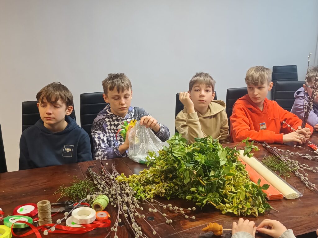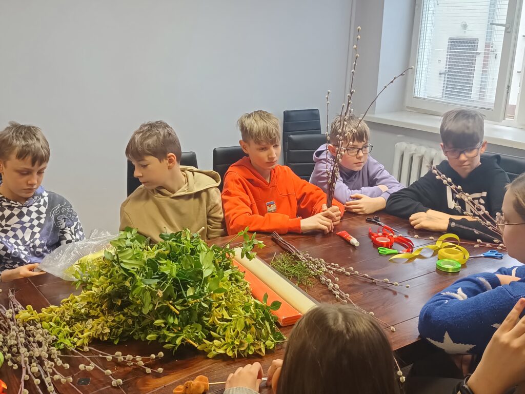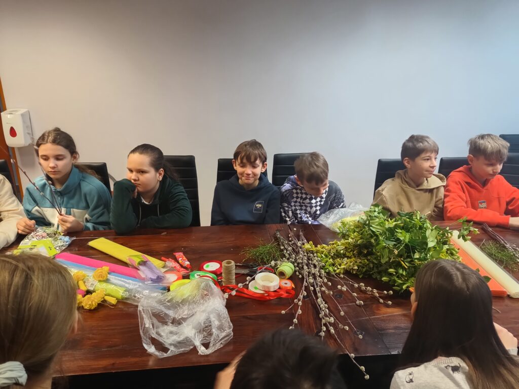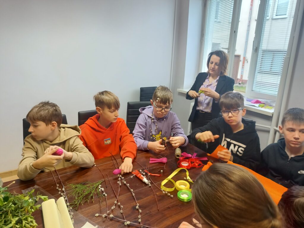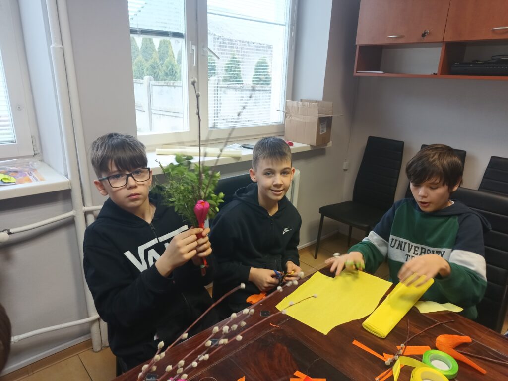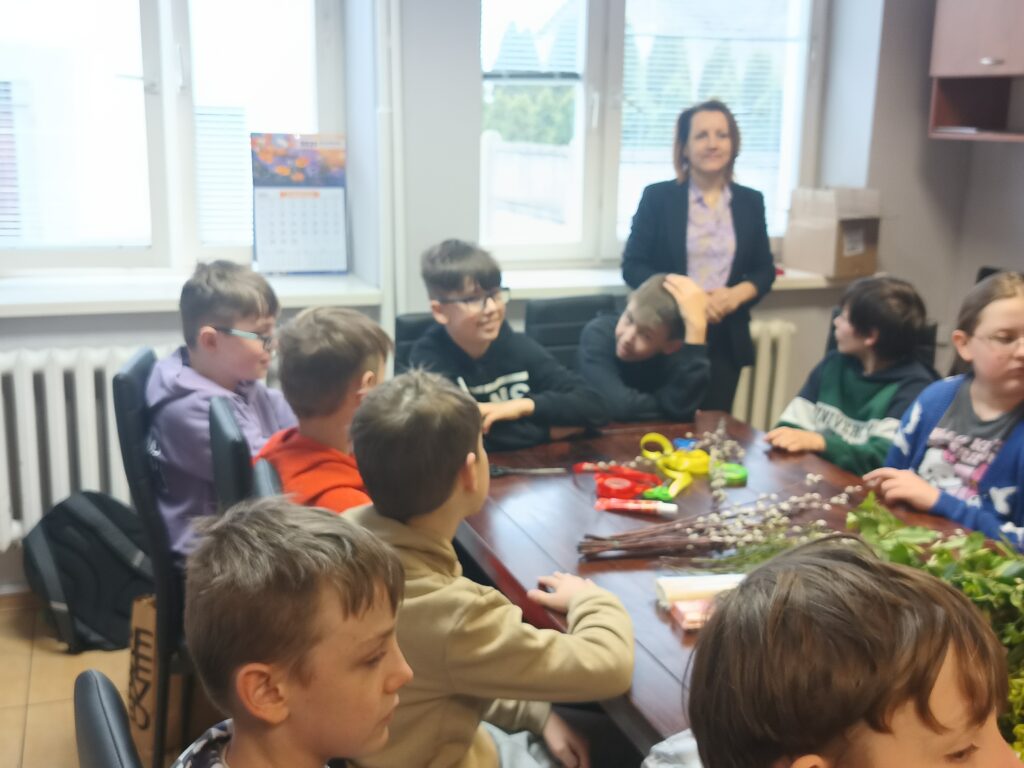 Uczniowie klasy V b wraz z wychowawczynią już po raz drugi wykonywali własnoręcznie palmy wielkanocne. Zgodnie z tradycją nasze palmy zostały zrobione z wierzbowych gałązek z kotkami, które przyozdobiono kolorowymi kwiatkami z papieru. Wspólne robienie palm wielkanocnych, obok motywu podtrzymywania tradycji, było okazją do integracji uczniów.