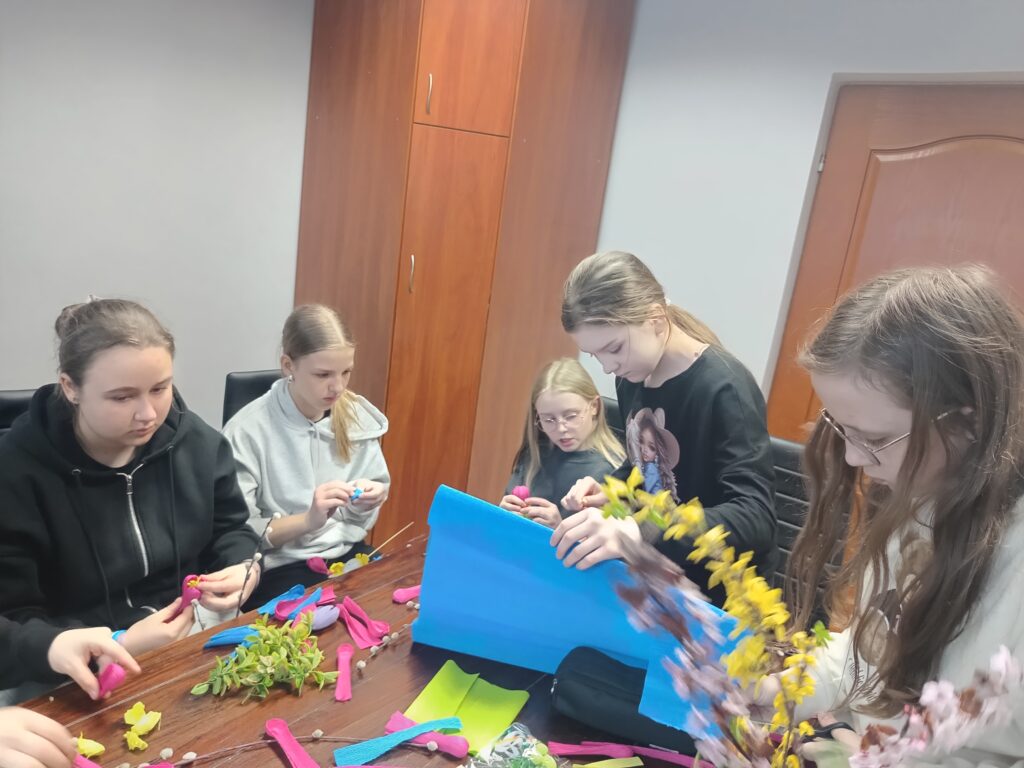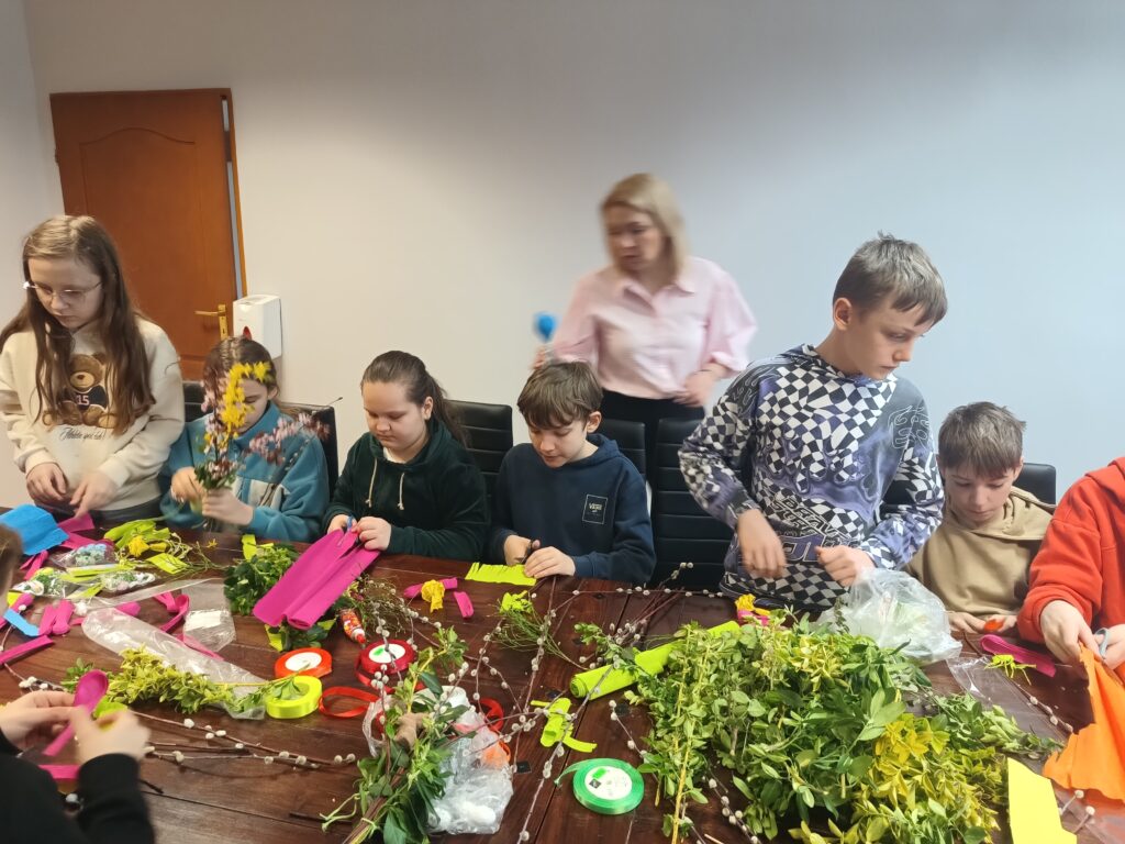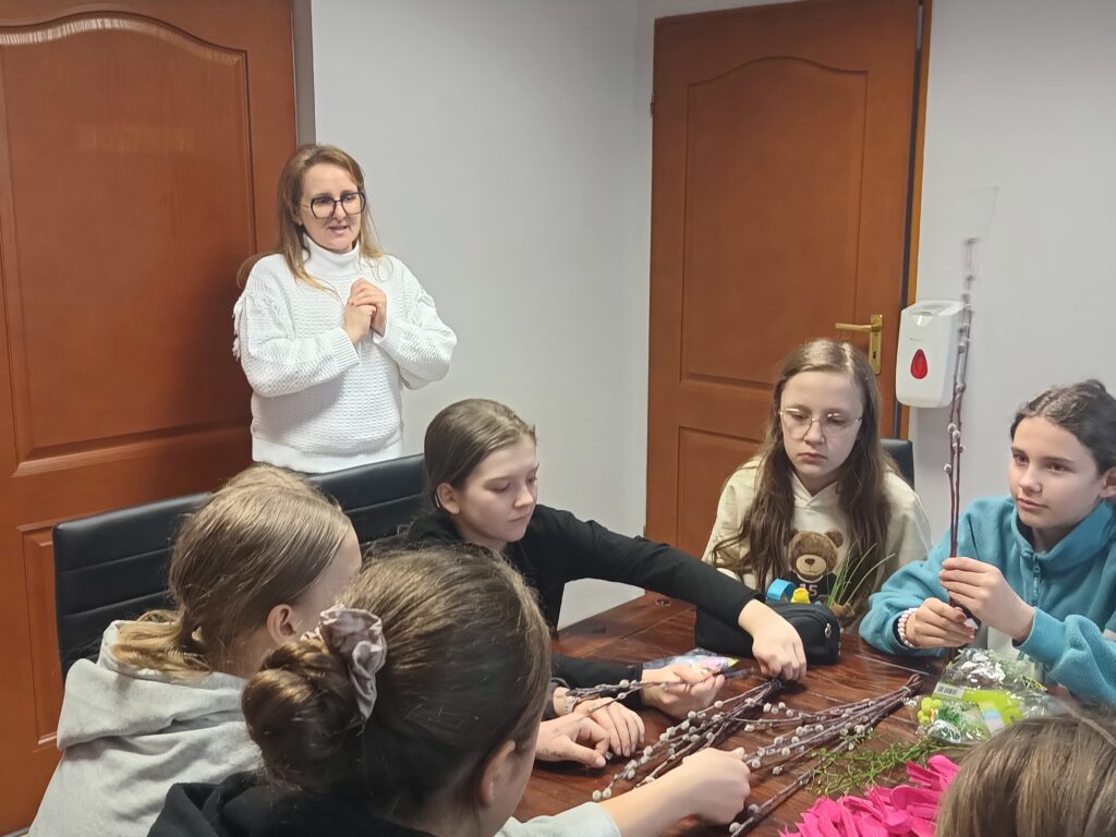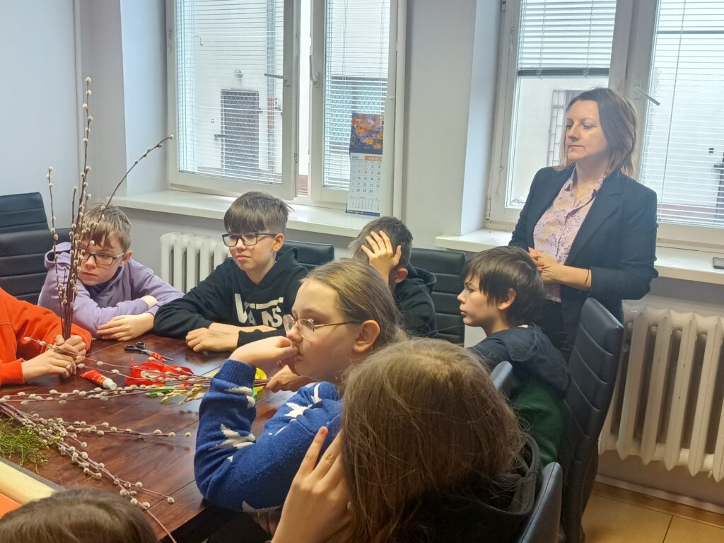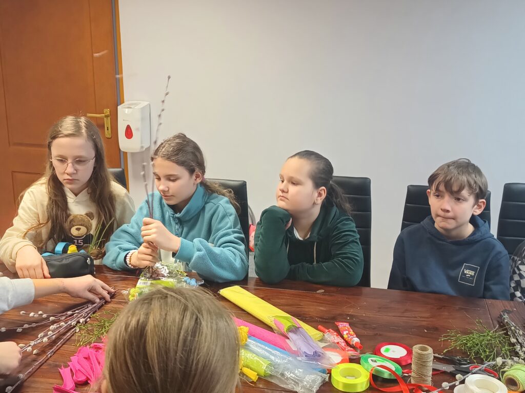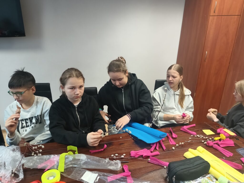 Uczniowie klasy V b wraz z wychowawczynią już po raz drugi wykonywali własnoręcznie palmy wielkanocne. Zgodnie z tradycją nasze palmy zostały zrobione z wierzbowych gałązek z kotkami, które przyozdobiono kolorowymi kwiatkami z papieru. Wspólne robienie palm wielkanocnych, obok motywu podtrzymywania tradycji, było okazją do integracji uczniów.